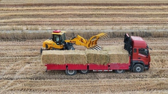 放眼田間,只見(jiàn)收割機(jī)在金黃的麥浪中穿梭,而緊跟其后的秸稈摟草機(jī)和打捆機(jī)則默契配合。摟草機(jī)將散落的秸稈聚攏成整齊的條狀,隨后打捆機(jī)精準(zhǔn)作業(yè),把秸稈壓縮、捆綁成緊實(shí)的草捆。短短幾分鐘,原本雜亂的金黃色秸稈被打捆成塊,宛如散落田間的一塊塊“黃金磚”,等待后續(xù)利用。“現(xiàn)在,有了新型秸稈打包機(jī)這個(gè)秸稈離田的‘利器’,不僅避免了秸稈焚燒對(duì)大氣質(zhì)量的影響,還提升了河道的水質(zhì),解決水稻的草害,提高水稻種子發(fā)芽率,有利于提升水稻畝產(chǎn)量。”黃海農(nóng)場(chǎng)第九生產(chǎn)區(qū)主任宋光華興高采烈地說(shuō)。