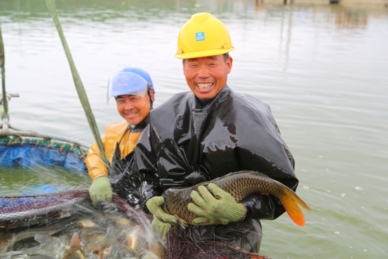 正值淡水魚出塘上市季節(jié),江蘇省連云港市海州區(qū)江蘇農墾崗埠農場南漁場,大型吊車正在起網捕撈鯉魚,一幅人歡魚躍的水上夏收景象。圖為漁民在展示捕撈的大鯉魚。 徐衛(wèi) 攝(來源:大國三農)