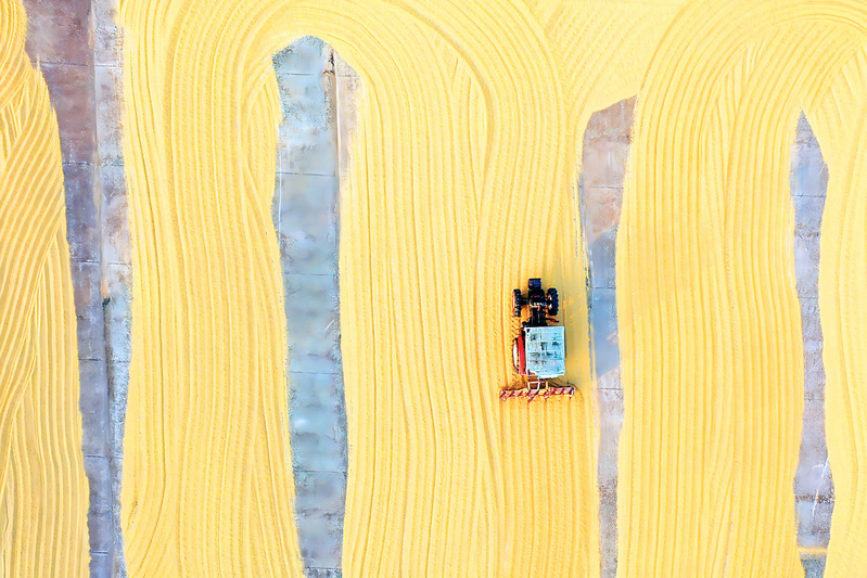 10月27日,連云港市海州區(qū)的江蘇農(nóng)墾崗埠農(nóng)場(chǎng),職工駕駛糧食翻曬機(jī)械在場(chǎng)上來回穿梭,翻曬剛剛收獲的水稻。 陶桂軍 嚴(yán)連鳳 攝(視覺江蘇網(wǎng)供圖)