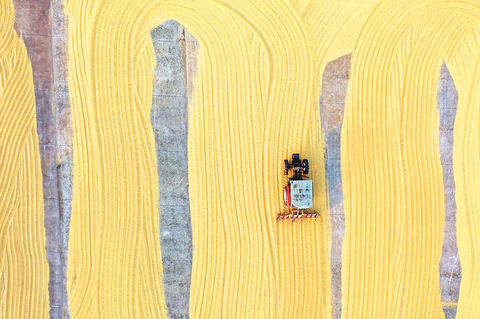 10月27日,連云港市海州區(qū)的江蘇農(nóng)墾崗埠農(nóng)場,職工駕駛糧食翻曬機(jī)械在場上來回穿梭,翻曬剛剛收獲的水稻。 陶桂軍 嚴(yán)連鳳 攝(視覺江蘇網(wǎng)供圖)