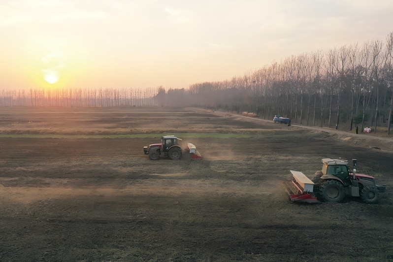 近日,連云港市海州區,播種機正在江蘇農墾崗埠農場高標準農田里播種小麥。當地職工正在搶抓農時,進行小麥播種工作,為明年糧食豐收打好基礎。