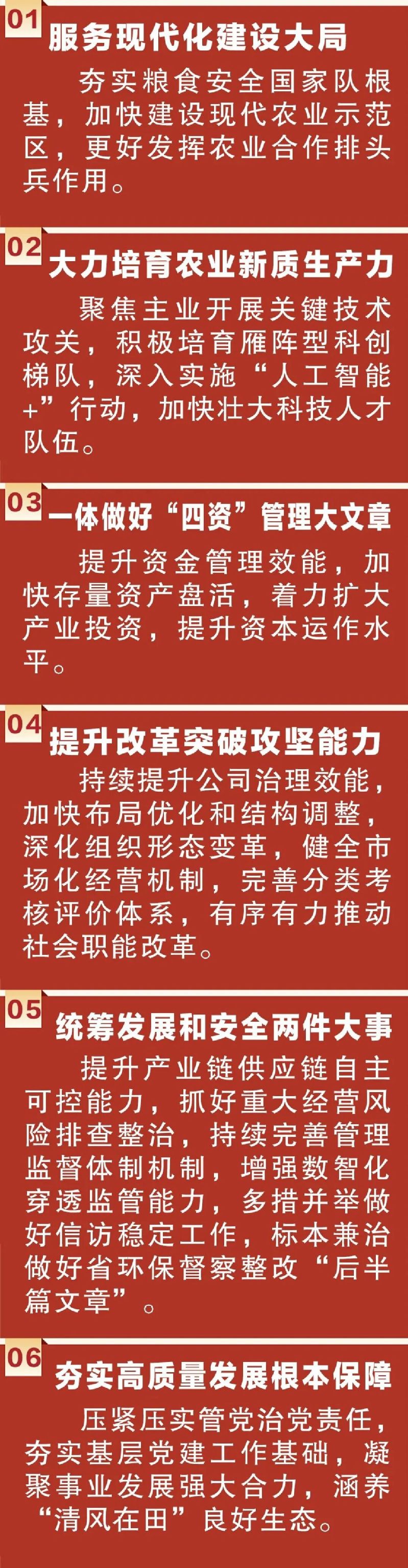 姜建友在報告中指出,2026年,要重點抓好十個方面工作任務(wù),全力優(yōu)存量、擴(kuò)增量、提質(zhì)量、防風(fēng)險,確保實現(xiàn)“十五五”開門紅、開門穩(wěn)。要毫不放松抓好糧食生產(chǎn),堅持產(chǎn)量產(chǎn)能、生產(chǎn)生態(tài)、增產(chǎn)增收一起抓,促進(jìn)良田良種良機(jī)良法集成增效,協(xié)同推進(jìn)優(yōu)土、優(yōu)種、優(yōu)產(chǎn)、優(yōu)儲、優(yōu)銷“五優(yōu)聯(lián)動”,著力提升糧食綜合生產(chǎn)能力。要做大做強農(nóng)業(yè)龍頭企業(yè),做強現(xiàn)代種業(yè),鞏固行業(yè)龍頭,提升農(nóng)場產(chǎn)業(yè),更好發(fā)揮引領(lǐng)帶動作用。要鞏固壯大特色優(yōu)勢產(chǎn)業(yè),推動產(chǎn)業(yè)重構(gòu)、技術(shù)升級、產(chǎn)品迭代和模式創(chuàng)新,鞏固壯大醫(yī)藥健康、城鄉(xiāng)建設(shè)服務(wù)、商貿(mào)服務(wù)產(chǎn)業(yè),為集團(tuán)高質(zhì)量發(fā)展提供支撐。要開放協(xié)同推進(jìn)科技創(chuàng)新,強化聯(lián)合創(chuàng)新,注重自主研發(fā),發(fā)展智慧農(nóng)業(yè),以科技創(chuàng)新塑造未來發(fā)展新優(yōu)勢。要堅定不移深化國企改革,完善市場化機(jī)制,加快“兩非”“兩資”處置出清,深化辦社會職能改革,充分激發(fā)企業(yè)市場主體活力。要務(wù)實高效強化投資管理,以投資賦能產(chǎn)業(yè)升級,多渠道挖掘投資標(biāo)的,加強項目全過程管理,為高質(zhì)量發(fā)展注入強勁動能。要持之以恒加強品牌建設(shè),堅持以價值提升為核心,統(tǒng)籌做好品牌管理、傳播推廣與產(chǎn)品運營。要積極穩(wěn)妥防范經(jīng)營風(fēng)險,強化“兩金”管理,強化業(yè)財融合,強化“四位一體”,強化內(nèi)審防線,筑牢安全發(fā)展屏障。要盡心量力做好民生保障,用心做好民生實事,建強產(chǎn)業(yè)工人隊伍,深化文化文明創(chuàng)建,建設(shè)和美墾區(qū)。要堅決維護(hù)安全穩(wěn)定大局,抓實安全生產(chǎn),做好信訪工作,抓牢生態(tài)環(huán)保,實現(xiàn)高質(zhì)量發(fā)展和高水平安全良性互動。