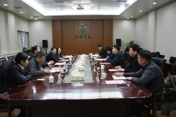 1月9日下午,中國人民財產保險股份有限公司江蘇省分公司黨委書記、總經理夏玉揚一行到集團公司溝通交流合作事宜。集團公司黨委書記、董事長魏紅軍接待并座談。省糧食和物資儲備局副局長季俊秋、集團公司黨委委員、