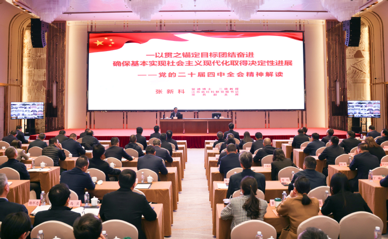 按照省委統(tǒng)一部署,11月19日,學(xué)習(xí)貫徹黨的二十屆四中全會精神省委宣講團報告會在江蘇農(nóng)墾舉行。省委宣講團成員、省社科聯(lián)黨組書記、常務(wù)副主席張新科作宣講報告。集團黨委副書記、總經(jīng)理姜建友主持報告會。報告會上,張新科圍繞學(xué)習(xí)貫徹習(xí)近平總書記在黨的二十屆四中全會上的重要講話精神和全會《建議》,從深刻認識黨的二十屆四中全會的重大意義,準(zhǔn)確把握“十五五”時期在基本實現(xiàn)社會主義現(xiàn)代化進程中的重要地位,全面理解“十五五”時期經(jīng)濟社會發(fā)展的戰(zhàn)略任務(wù)和重大舉措等方面,結(jié)合我國經(jīng)濟社會發(fā)展實際情況,運用生動案例和翔實數(shù)據(jù),進行了系統(tǒng)闡釋和全面解讀。他指出,全會取得的重大成果、作出的重大部署,充分體現(xiàn)了以習(xí)近平同志為核心的黨中央團結(jié)帶領(lǐng)全黨全國各族人民續(xù)寫經(jīng)濟快速發(fā)展和社會長期穩(wěn)定兩大奇跡新篇章、奮力開創(chuàng)中國式現(xiàn)代化建設(shè)新局面的歷史主動,必將對黨和國家事業(yè)發(fā)展產(chǎn)生重大而深遠的影響。要把學(xué)習(xí)貫徹全會精神同學(xué)習(xí)領(lǐng)會習(xí)近平新時代中國特色社會主義思想貫通起來,結(jié)合習(xí)近平總書記對江蘇工作重要講話精神,做到學(xué)深悟透、狠抓落實,奮力譜寫“強富美高”新江蘇現(xiàn)代化建設(shè)新篇章。姜建友在主持報告會時指出,學(xué)習(xí)好、宣傳好、貫徹好黨