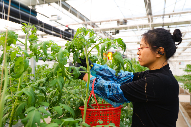 時值12月,云臺大地寒意漸濃,興墾科技植物工廠在陽光的艷照下格外耀眼,“產自興墾植物工廠的小番茄,歷年來個頭顏色相似、品感穩定,秘密都在這個充滿科技范的溫室里。”正在忙碌的植物工廠“管家”淤秀林笑意連連。打開植物工廠兩層大門,清新濕潤的氣息撲面而來,栽培架成排林立,一排排整齊的番茄植株正茁壯成長,翠綠的枝葉在燈光與陽光交織下閃爍,技術人員手持工作筆記穿梭其間統計數據,工人站在智能化升降工作車上沿軌道對番茄藤進行盤頭、繞蔓,2200平方米空間、10余個小番茄品種的生長透出濃濃的科技范。技術員於秀林說“植物工廠番茄并非扎根于傳統土壤,而是‘住’在椰糠之中。椰糠是用椰子外殼纖維加工而成的基質,具有良好的透氣性、保水性和排水性,為番茄根系提供了一個絕佳的生長環境。它既能夠穩固植株,又能讓根系自由地呼吸和吸收養分,是番茄舒適的“綠色床鋪”。不僅如此,小番茄還享受著水肥一體的滴灌系統的施肥終端。每株番茄配備一根滴箭,里面是技術人員根據選擇品種生長習性調配出的水肥營養液,電腦端設置好用量和次數,每隔一段時間,自動精準滴灌施肥。”說話間,技術員拔出一支滴箭,仔細檢查根部濕度,他現在將終端設置聯網在了自