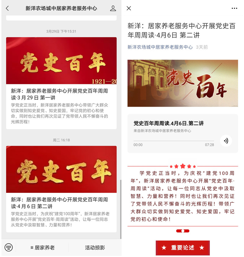 連日來,新洋農場有限公司以多種形式開展黨史學習教育,強化黨員干部黨史學習教育參與度,確保黨史學習教育取得實效。其中居家養老服務中心利用中心微信公眾號開展的“黨史百年·周周讀”活動讓職工群眾再次見證黨帶領人民不懈奮斗的光輝歷程,受到大家的一致好評。