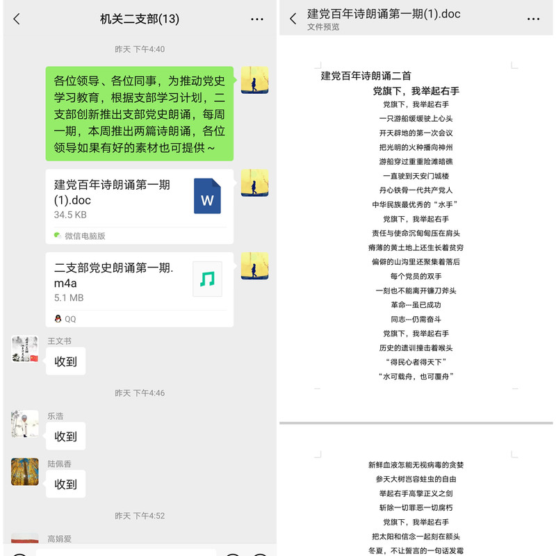 “黨旗下,我舉起右手,一只游船緩緩駛上心頭,開天辟地的第一次會(huì)議,把光明的火種播向神州……”4月21日,新洋農(nóng)場(chǎng)有限公司機(jī)關(guān)二支部微信群里,支部黨建助理員分享了建黨百年朗誦第一期音頻,這是該支部創(chuàng)新黨史學(xué)習(xí)教育形式的新內(nèi)容。自黨史學(xué)習(xí)教育開展以來,機(jī)關(guān)二支部緊緊圍繞“學(xué)黨史、悟思想、辦實(shí)事、開新局”總要求,堅(jiān)持多措并舉,力求黨史學(xué)習(xí)教育走“新”更走“心”。
