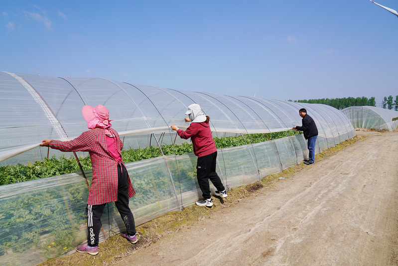 田間,種植戶江月香正在給瓜棚揭膜透氣,看到陳主任連聲感謝說,要不是昨天你幫忙帶人將瓜棚整理好,我和隔壁田的老單就得損失好幾十萬元了。隔幾條田正在西瓜大棚里授粉的老單聽到陳主任的說話聲,連忙從棚里走來說感謝。429日晚,受東北冷渦影響,8-10級的雷暴大風夾雜著冰雹襲擊農場,第三生產區12連的西瓜生產基地有十多家西瓜種植戶受到不同程度的損害,其中位于風口處的小江和老單家有近40個大棚受損,望著整條田被風刮飛的大棚,江月香急得直掉眼淚。天氣報告預測還有大風和雷暴發生,當前全場都在賣西瓜,用工緊張,半天沒找到幾個幫忙的人,下雨前大棚不整理好,眼看就要到手的收成就全完了。陳主任急忙打電話組織人員,并將生產區管理人員喊到田間,一起幫助拉膜,束繩,直到傍晚才將受損田塊全部整理好,然后將生產區所有種植戶都一家一家全部查看一遍他才踏上回家的路。