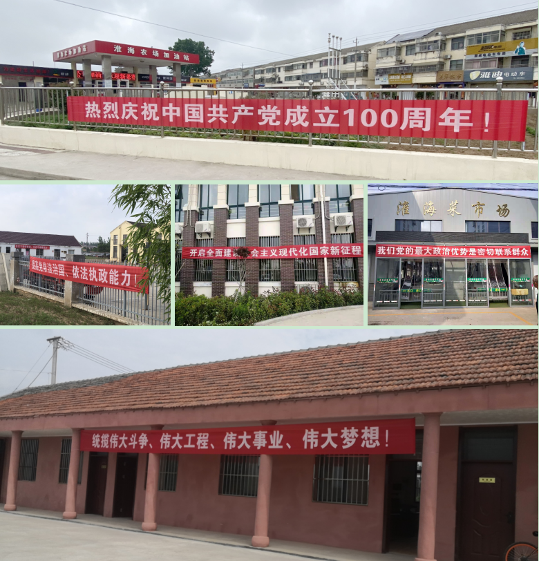 “七一”期間,無論是在淮海農(nóng)場(chǎng)場(chǎng)部小城鎮(zhèn),還是各分場(chǎng)社區(qū)或是二三產(chǎn)單位,我們?cè)?/span>這些單位,總會(huì)看到那一抹“中國紅”,這些黨史學(xué)習(xí)教育的文字橫幅,成為淮海農(nóng)場(chǎng)靚麗的風(fēng)景線,振奮著人心,激勵(lì)著人們向前向前永向前。