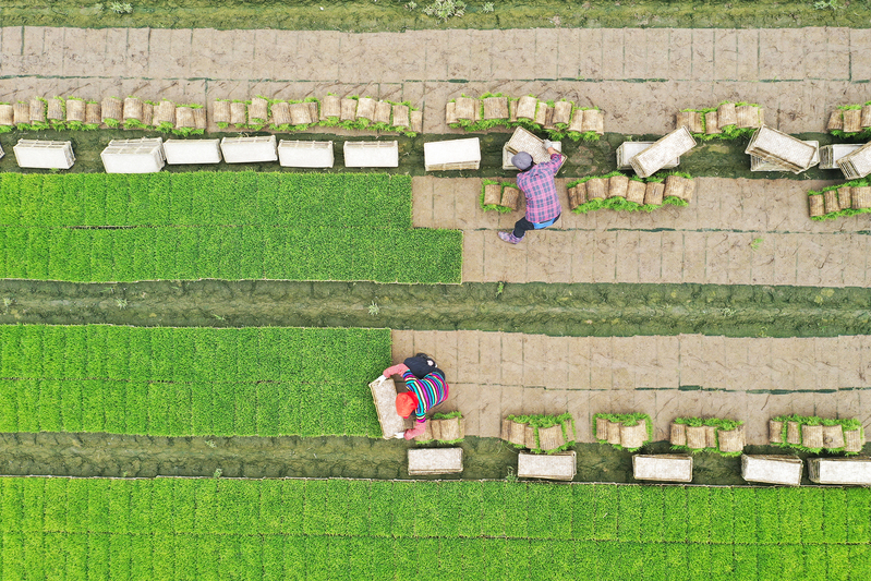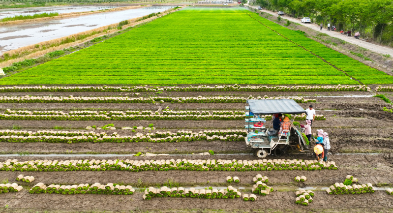 日映田水,風漾秧池。6月18日,蘇墾農發白馬湖分公司第一生產區田間地頭呈現一派忙碌景象。秧苗被揭起、卷好,隨即放到插秧機上栽插。