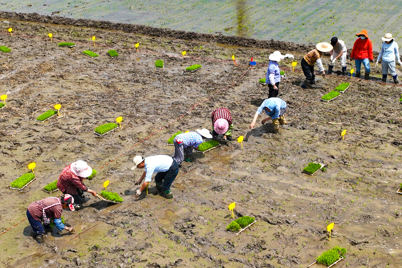 端午假期第一天,蘇墾農發南通分公司3大隊田頭一片忙碌景象。烈日下,7位農技人員彎著腰在水稻田一字排開移栽秧苗,腳下步履維艱、鼻頭汗珠滴落。按照隊伍兩頭農技人員手拉的直線,他們小心翼翼地從秧盤上取下秧苗,左手握苗,右手插秧,確保行距25厘米,株距20厘米,每穴2株,橫豎成線、深度適中。每隔一段距離,田間都會插上一塊寫明實驗數據的標簽。“不同的標簽對應了不同的試驗稻種。人工插秧可以確保水稻增產試驗的科學性、嚴謹性、準確性。”蘇墾農發南通分公司農業中心主任趙中華表示。今年,蘇墾農發南通分公司大力推進農業科技創新,與南通大學生命科學學院合作開展水稻高產技術研發,為南通稻米產業供給性結構優化、品質提升、節本增效和綠色高產提供技術支撐。前期,校企雙方分別對南粳46、南粳5055稻種以微波、離心、超聲波等3種方式,按時間長度各進行32種處理。落谷前,蘇墾農發南通分公司對不同品種、不同處理的水稻種子提前進行了篩選、收集、稱重、貼標、裝袋等準備工作,同時與相關農業大隊溝通協調好浸種催芽時間,在種子露白后及時安排工人與農機,掌握好落谷的最佳時機與最優質量,控制種子秧盤播撒的均勻度,精準把控好土壤濕度與精細