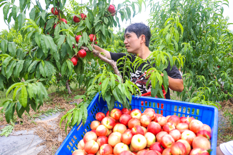 6月19日,云臺農場云水灣濕地公園鮮桃采摘基地桃果飄香。一株株桃樹綠意盎然,在層層疊疊的綠葉下,一個個飽滿圓潤的桃子綴滿枝頭,紅粉色的果實壓彎了樹梢,甚是喜人。工作人員正在桃樹下忙著摘桃、裝筐、運送,一派繁忙的豐收景象。
