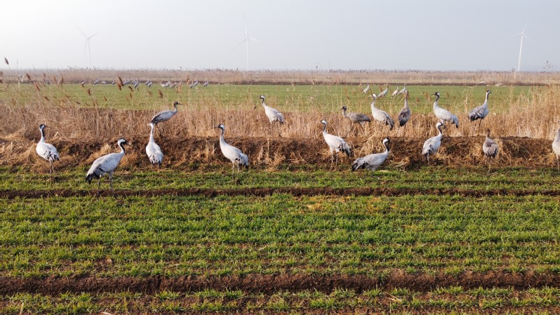 “快看,好多大鳥!”1月12日上午,在淮海農(nóng)場七分場社區(qū)墾三隊(duì)的麥田里,分場技術(shù)員王凌云在用無人機(jī)巡田時(shí),突然發(fā)現(xiàn)了成群的灰鶴及幾只稀有丹頂鶴在此棲息。為留下這些珍稀鳥類的影像資料,他連忙用無人機(jī)對準(zhǔn)拍攝,記錄下這些鳥兒在這里駐足的珍貴鏡頭,這也是淮海農(nóng)場首次看到如此多的珍稀鳥類群體聚集在此越冬。七分場是淮海農(nóng)場最東端的一個(gè)分場,毗鄰國家丹頂鶴自然保護(hù)區(qū),占地1萬多畝,與黃海一堤之隔,海岸線南北長達(dá)近5公里。堤外濁浪滾滾,堤內(nèi)綠意濃濃,少人的管理,靜謐的環(huán)境,綠色的麥苗,搖動的風(fēng)車和黃色的枯草,讓這里的生態(tài)風(fēng)景如畫。近百只灰鶴和丹頂鶴組成的“團(tuán)隊(duì)”落腳農(nóng)場麥地,它們或追逐嬉戲,或駐立棲息,或低頭覓食,在無人機(jī)的視角下,盡顯生態(tài)之美、和諧之美、發(fā)展之美。“我是在墾三隊(duì)麥田里看見它們,當(dāng)時(shí)離它們差不多200米左右,但是距離太遠(yuǎn)不能完全確定,后來請我們生產(chǎn)區(qū)珍禽巡護(hù)員梁永河與珍禽保護(hù)區(qū)專家聯(lián)系辨認(rèn),才確定是國家一級保護(hù)動物丹頂鶴和國家二級保護(hù)動物灰鶴。”王凌云說,當(dāng)時(shí)農(nóng)渠里飄起毛茸茸的蘆花,襯得麥苗綠油油,綠黃交界處,立著一群雪白身影,丹頂鶴和灰鶴悠然踱步其間,自成風(fēng)景,讓我倆甚是贊嘆。多年