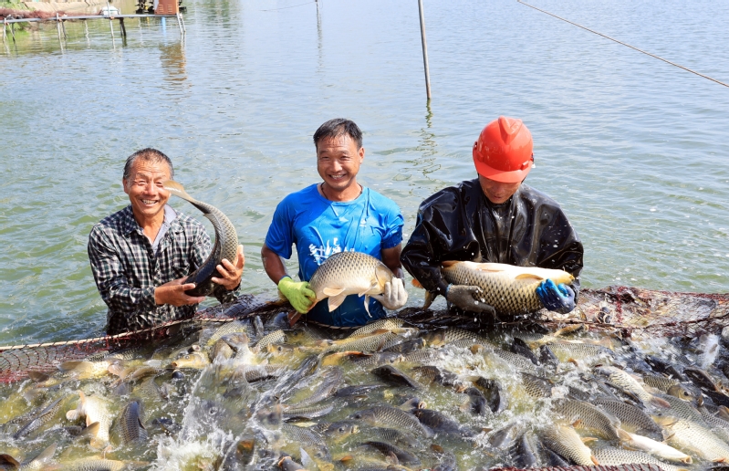 8月5日,崗埠農場水產公司職工正在忙著捕魚銷售。崗埠農場不斷優化養殖結構,實行“輪捕輪放”“魚蝦混養”等新技術養殖,采取“一次放足,分批捕撈,捕大補小”放養模式,確保全年都有鮮活魚上市。該場水產養殖面積2500畝,主養鯉魚的池塘平均畝產“淮河牌”商品魚2200公斤,示范塘口最高單產達2600公手,最高畝效益5000元。