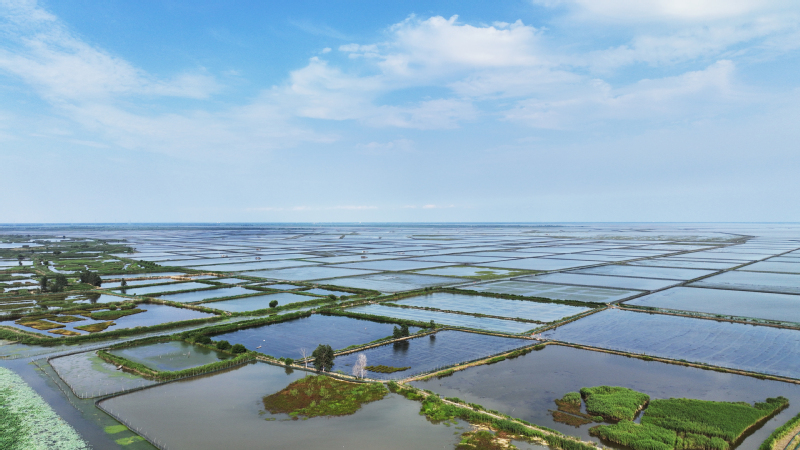 復興圩農場公司擁有5000畝高郵湖灘,近年來,通過水資源利用、水環境治理、水生態保護,促進了人與自然的和諧共融。圖為復興圩高郵湖灘的水產養殖網格,碧水藍天,景美如畫。