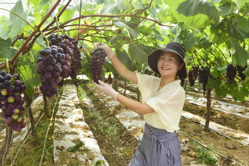 8月3日,在射陽縣淮海農場高效園區5畝連棟高架大棚葡萄園內,碩大成串的葡萄綴滿枝頭,就連空氣中也彌漫著沁人心脾、清新的水果味,經過園區工人的精心培育,一串串綠色或黑色晶瑩的葡萄掛在藤架上,令人垂涎欲滴。入口品嘗,個個飽滿多汁,甜而不膩。慕名來采摘觀光的游客,在葡萄園內一邊抬頭觀賞、一邊低頭采摘(如圖),幸福的滋味綻放在臉龐。在葡萄園里,剛剛用微信掃碼后的淮海居民吉長明興奮地說:“我每年都要來到園區買幾箱葡萄,這里的葡萄不僅口感好,果也大,讓城里的人也來嘗嘗我們農場獨特的‘土特產’。”據他講,每年城里的親朋好友每到這個季節,就要托他買幾箱葡萄帶到城里去。據了解,園內種植品種“夏黑”和“陽光玫瑰”等葡萄品種,畝產量可達4000斤上下。特別是其統一施用農家肥、無公害防蟲防病、反光膜覆蓋、科學滴灌、疏果等措施,輔助于智能化的通風調溫、噴淋調水和調節光照設施的開展,合理調節土壤水分,降低田間溫、濕度,也減輕各類病蟲害的侵襲,讓葡萄按規定設計的要求進行掛果,確保種出安全、優質的葡萄提供給消費者。“我們的葡萄每斤售價在8元/斤,一畝地毛收入可達20000元。”園區負責人解進空說,“是良好的品質和采摘