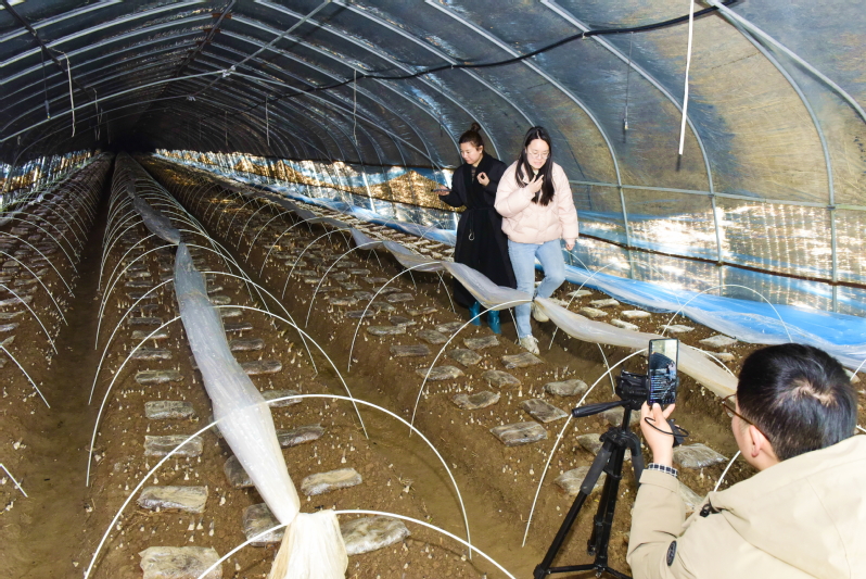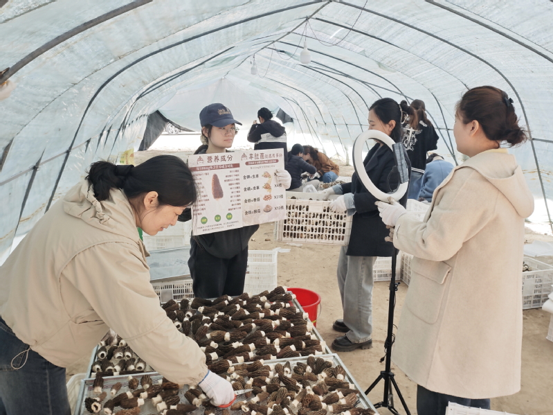 3月11日下午,淮海農場新媒體直播間主播助播深入農場產業發展菌菇種植基地,開展生產流程直播助農活動,為即將上市的“墾一代”羊肚菌造勢,貢獻青春力量。圖為主播助播正在大棚內直播。